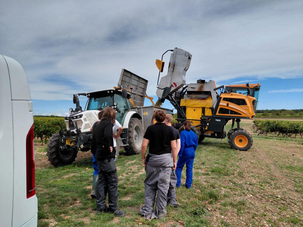 Comme la saison se prêtait aux vendanges et que le chantier s’est fait dans les temps, le président de l’AF (et viticulteur) a bien voulu montrer aux élèves comment se faisaient le ramassage des raisins ainsi que le pressage.