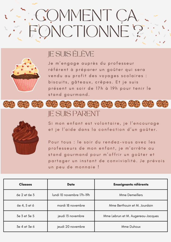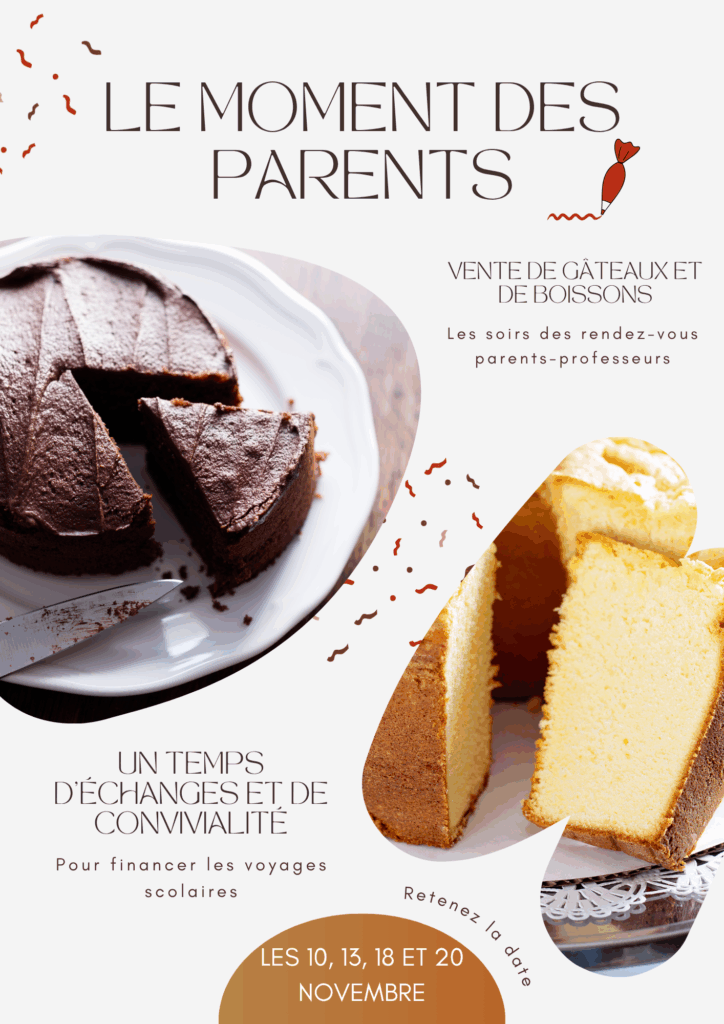 Nous tenons à impliquer les élèves dans cette action : c’est pourquoi les élèves de 6e et de 3e volontaires pourront préparer un gâteau et/ou tenir le stand lors d’une soirée.
